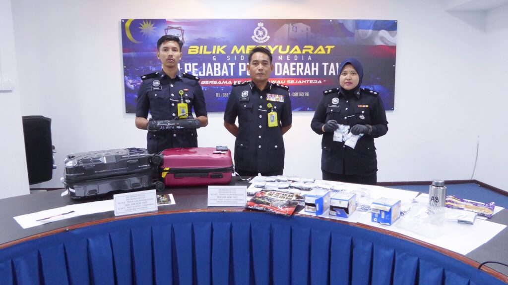 “Pemeriksaan terhadap bagasi yang dibawa suspek kedua menemukan bungkusan mengandungi dadah jenis syabu seberat lebih kurang 2,493.45 gram dengan nilai anggaran rampasan berjumlah RM87,000.00,” jelas ACP Jasmin.