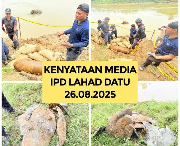 Lahad Datu: Polis Lahad Datu mengesahkan pemusnahan sebutir bom lama jenis Unexploded Ordnance (UXO) Aerial Bomb yang berjaya ditemui dan dimusnahkan dengan selamat di tebing Sungai Segama, Kampung Batu 8, Lahad Datu pada 24 Ogos lalu.