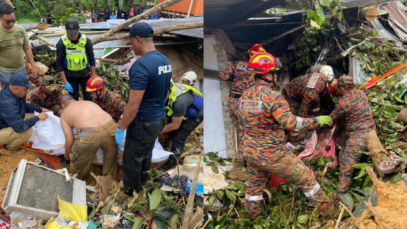 Papar: Dua beranak terdiri daripada seorang wanita dan anak lelakinya ditemui maut selepas tertimbus dalam kejadian tanah runtuh yang menghempap tiga buah rumah di Kampung Mook, Kinarut pagi tadi.