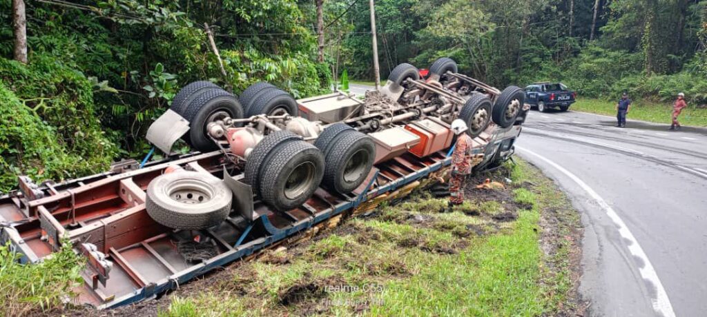 Komander Operasi, PBK I Selverinus Sixtus Geoffrey berkata, kemalangan itu melibatkan sebuah lori treler bermuatan barangan yang dipercayai hilang kawalan lalu terbabas ke bahu jalan.