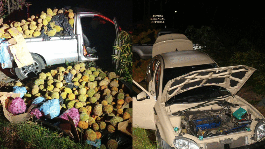 KENINGAU: Seorang pemandu kereta Proton cedera dalam kemalangan jalan raya membabitkan sebuah pacuan empat roda (4WD) yang sarat dengan muatan buah durian di Jalan Agudon, di sini, pada malam Rabu.