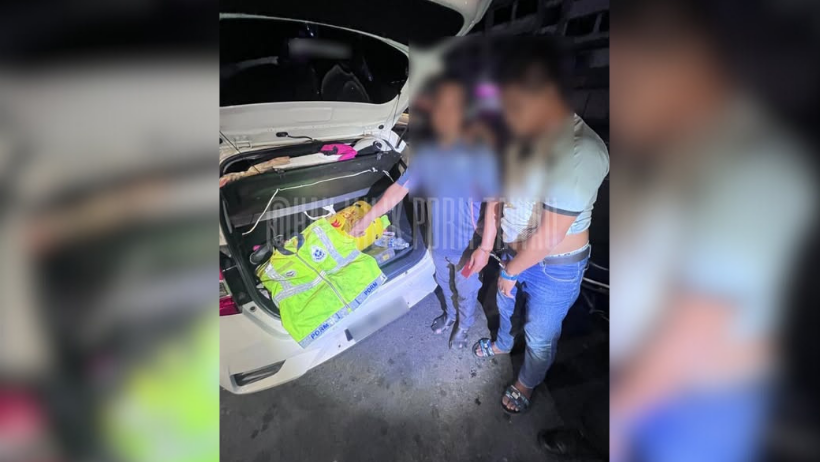 “Hasil pemeriksaan ke atas kenderaan yang dinaiki suspek, polis menemui satu vest pantylilan berwarna hijau bertulis ‘PDRM’ serta sebuah topi berlambang loreng,” katanya dalam kenyataan di sini, hari ini.