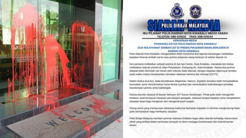 KOTA KINABALU: Polis menjalankan siasatan berhubung dua kes khianat melibatkan perbuatan menyimbah cat merah di dua premis pinjaman wang berlesen di sekitar bandar raya ini, hari ini.